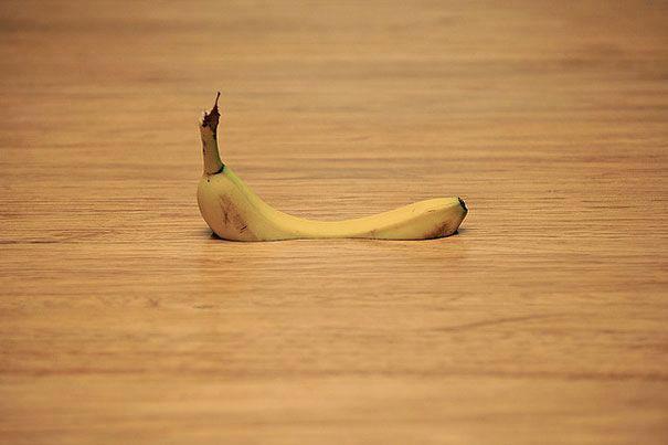 En la primera, vemos simplemente un plátano incrustado en un suelo de madera. Mientras que en la segunda, la fruta cobra vida y se transforma en una persona tumbada en una hamaca (pulpa del plátano), que mueve otro personaje (cáscara del plátano).
