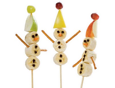 Algo tan sencillo como unos pinchitos de plátano, formando un muñeco, con la ayuda de manzana y palitos de galleta, puede despertar la atención de los niños pequeños hacia la fruta.