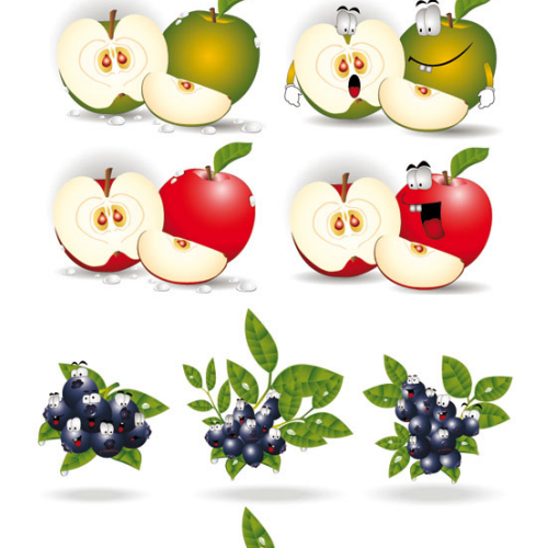 Arte con frutas en ilustraciones de vector: Caricaturas de manzanas y uvas.