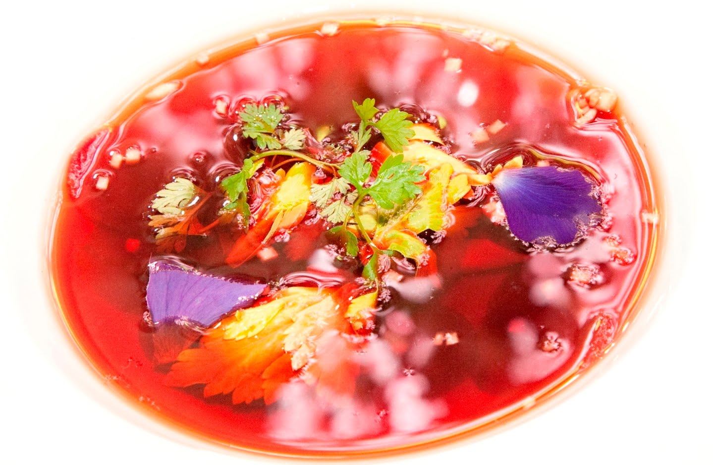 Buscando la representación de los alimentos en las distintas artes, encontré este plato impresionista que, además de ser una belleza artística, seguramente será una delicia. Procede del blog: comosusanacome y vemos la gastronomía no pierde recursos a la hora de diseñar platos para que resulten originales  y nutritivos. Esta obra es un consomé de verduras sobre carpaccio (*) de remolacha.