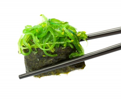 Bocado de Sushi con algas marinas.