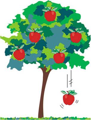 Hay un montón de manzanas en un árbol y de repente una se cae.