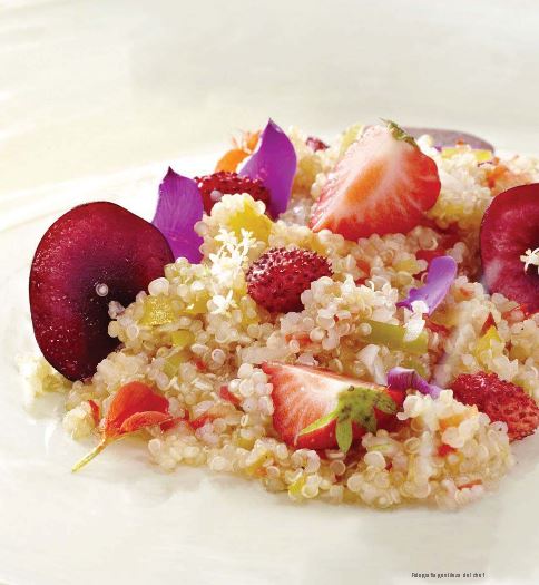 – Para servir, condimentar la quinua con la vinagreta de limón. Agregar encima del plato de quinua las fresas cortadas por la mitad, las cerezas laminadas, las fresitas enteras y finalmente las flores.