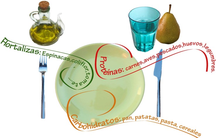 En este plato 1/3 del espacio se destina a los alimentos ricos en proteínas, 1/3 a las verduras y hortalizas y otro 1/3 a los carbohidratos, preferentemente integrales, legumbres y tubérculos como la patata.