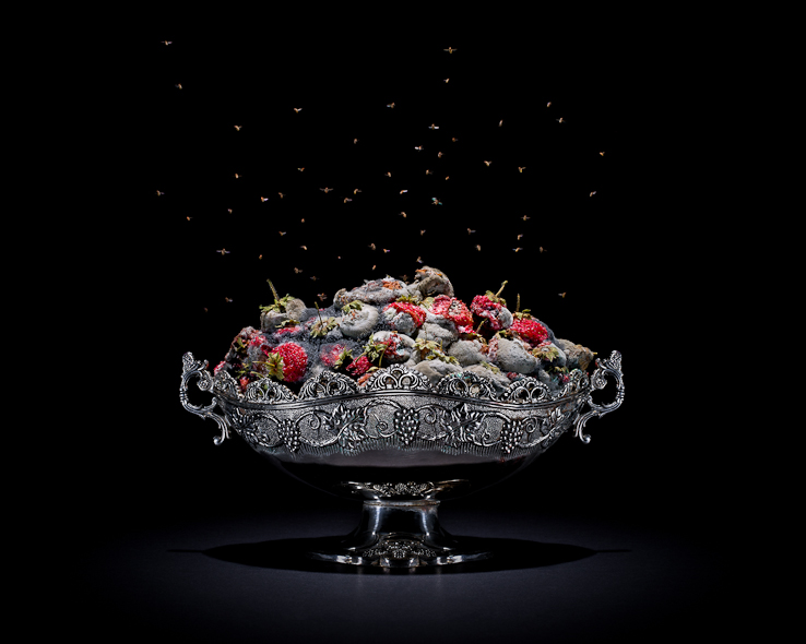 En una de estas fotos aparece una que piña cuelga encima de un antiguo plato dorado, y su piel, antes amarilla, ha dado paso a un mohoso verde luminoso; en otra, unas remolachas morado oscuro yacen cómodamente en un elegante florero de porcelana con delgadas láminas de filamentos grises acumulándose en su piel.