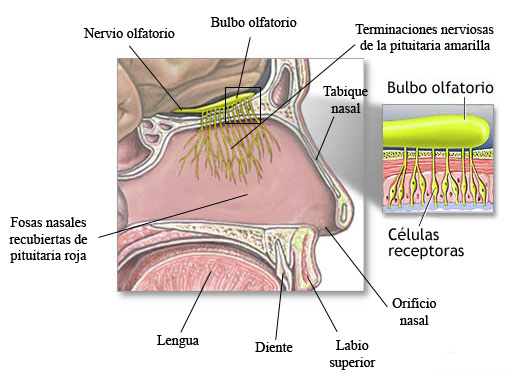 El bulbo olfatorio es una estructura que, como podemos ver en la imagen que sigue a este párrafo, se encuentra en nuestro sistema nervioso central y procesa las sensaciones olfativas procedentes del epitelio olfatorio.
